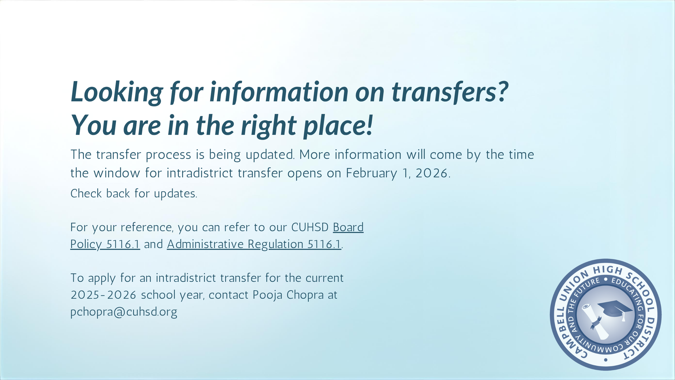 - Enrollment for New Residents: New residents to CUHSD must enroll for their home school based on their address before submitting transfer applications.